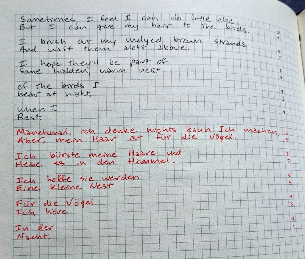 I’ve been learning German lately, and something that I found fun was writing a poem, then immediately translating it to a German version that captures the same form and feeling.